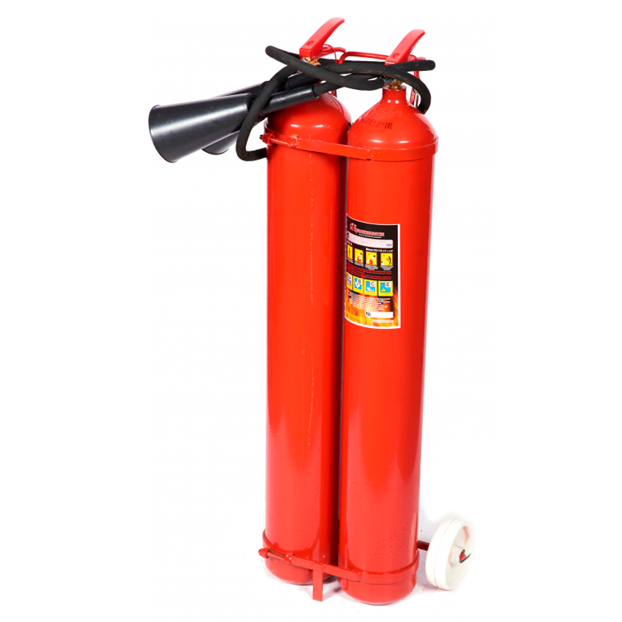 Передвижной углекислотный огнетушитель ОУ-15 с 2 баллонами, объемом 10 л каждый. Поставляется собранный. Предназначен для защиты объектов производственного и хозяйственного назначения, электроустановок под напряжением до 10 кВ. Вместимость корпуса составляет 2х10,05 л, масса заряда – 15 кг. Данный огнетушитель рассчитан на тушение объекта возгорания в течение 15 сек. при длине струи 4 м. Ранг по модельным очагам: 70В, С, Е (до 10000В)
