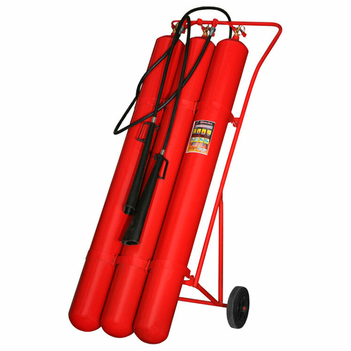 Передвижной углекислотный огнетушитель ОУ-55 с 3 баллонами, объемом 26 л каждый. Поставляется собранный, имеет резиновые колеса. Предназначен для защиты объектов производственного и хозяйственного назначения, электроустановок под напряжением до 10 кВ. Вместимость корпуса составляет 3х26 л, масса заряда – 50 кг. Данный огнетушитель рассчитан на тушение объекта возгорания в течение 20 сек. при длине струи 4 м. Ранг по модельным очагам: 144В, С, Е (до 10000В)