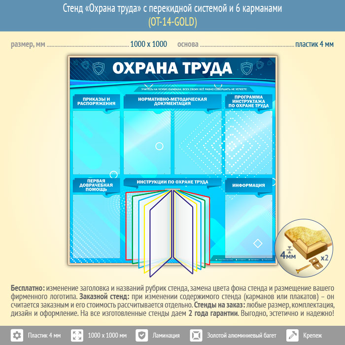 Стенд «Охрана труда» с перекидной системой и 6 карманами (OT-14-GOLD)