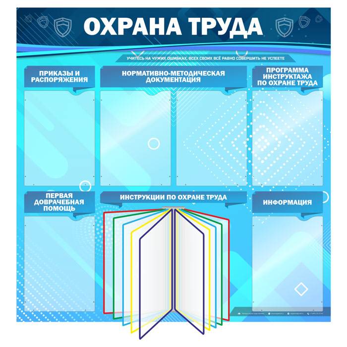 Стенд «Охрана труда» – это комплект из плоских карманов А4 формата для самостоятельного размещения информации: 1 карман – приказы и распоряжения, 2 кармана – нормативно-методическая документация, 1 карман – правила трудового распорядка, 1 – первая доврачебная помощь, 1 карман – информация и перекидная система для инструкций по охране труда…