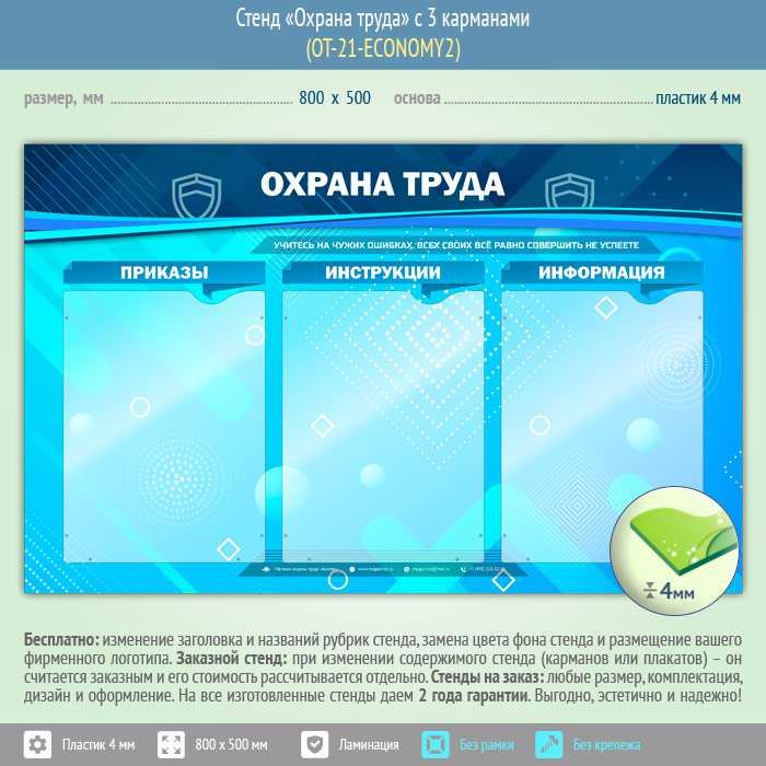 Мы единственные производители, ламинирующие стенды с карманами, т.к. считаем это необходимым для повышения надежности и долговечности. Защитный слой позволяет надолго сохранить привлекательный внешний вид стенда и защитить его от повышенной влажности, загрязнения и механических повреждений. Поэтому наши стенды можно смело протирать влажной тряпкой. Помимо этого, ламинирование придает изображению еще большую «сочность» и контрастность, т.е. улучшает и без того эстетичный внешний вид