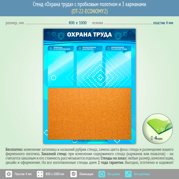 Стенд «Охрана труда» с пробковым полотном и 3 карманами (OT-22-ECONOMY2)