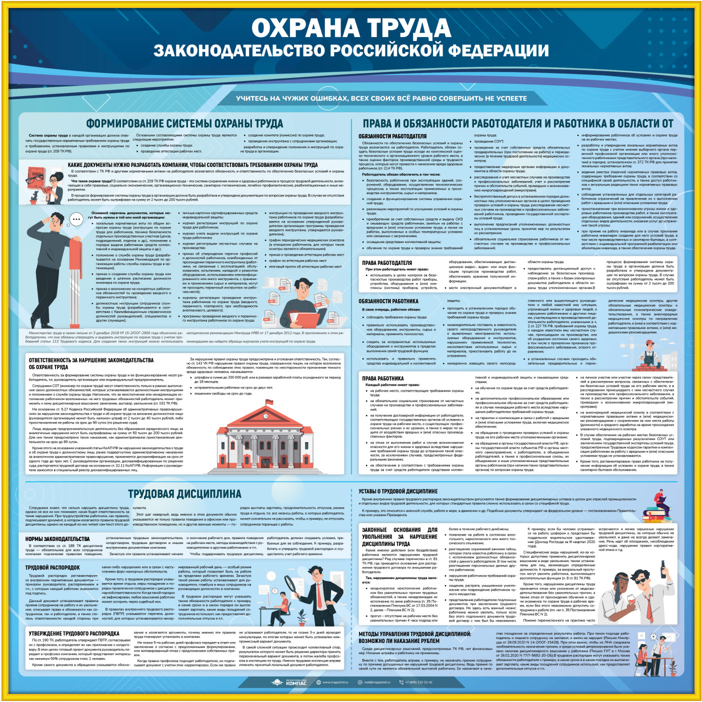 Стенд «Охрана труда. Законодательство Российской Федерации» содержит информацию про формирование системы ОТ, о том какие документы нужно разработать, чтобы соответствовать требованиям ОТ, об ответственности за нарушение законодательства в данной сфере. Также здесь вы найдете права и обязанности работодателя и работника в области ОТ, информацию о трудовой дисциплине - нормы законодательства, трудовой распорядок, уставы о трудовой дисциплине, законные основания для увольнения за ее нарушение и методы управления трудовой дисциплиной.