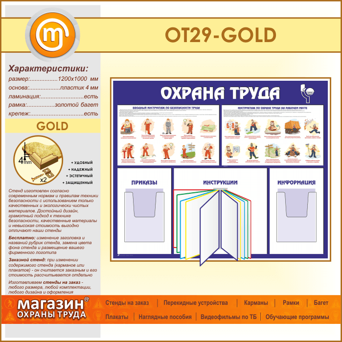 Стенд «Охрана труда» с перекидной системой и 2 объемными карманами (OT-29-GOLD)