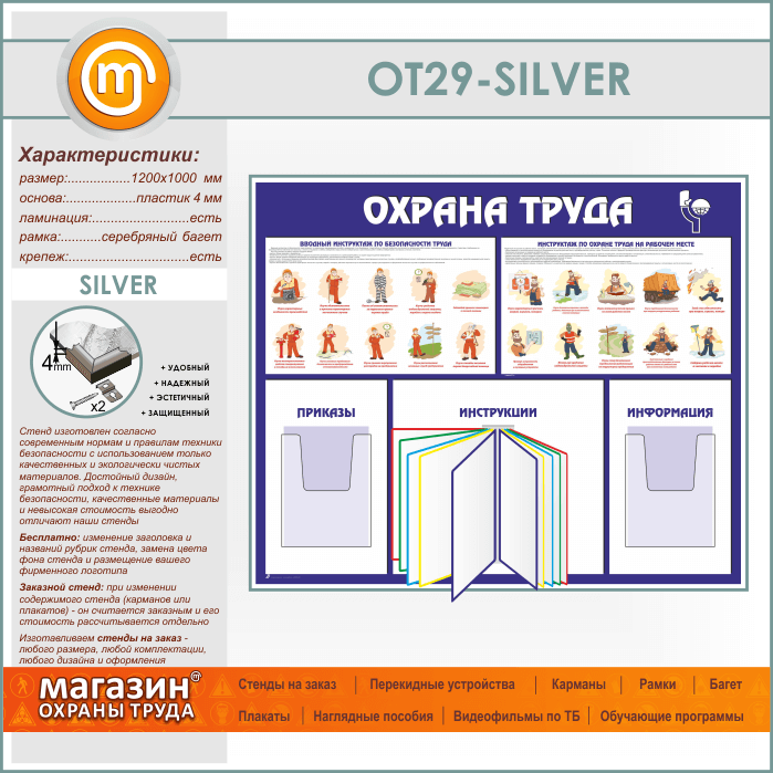 Стенд «Охрана труда» – яркий стенд на котором размещена полезная информация о вводном инструктаже по безопасности труда и инструктаж по охране труда на рабочем месте. Для самостоятельного размещения информации на стенде предусмотрено 2 объемных А4 кармана под приказы и информацию и одна перекидная система А4 формата на 10 рамок под инструкции…