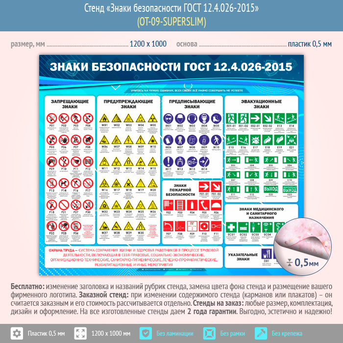 Стенд «Знаки безопасности ГОСТ 12.4.026-2015» содержит все знаки безопасности, согласно ГОСТ 12.4.026-2015, а именно: запрещающие и предупреждающие, предписывающие и эвакуационные, знаки пожарной безопасности, знаки медицинского и санитарного назначения, а также указательные знаки