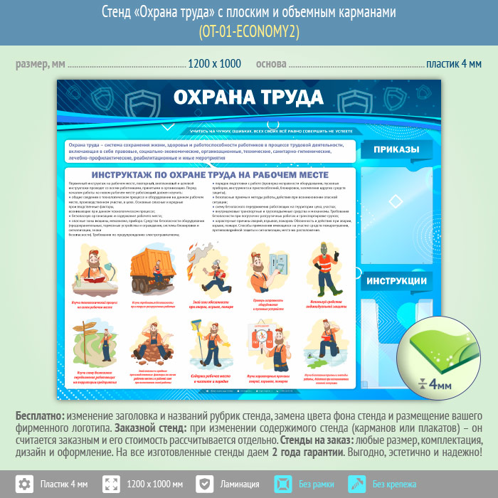 Стенд «Охрана труда» – это, прежде всего, содержательный и качественно проиллюстрированный первичный инструктаж на рабочем месте и два кармана: плоский А4 формата – для приказов и объемный А4 – для инструкций…