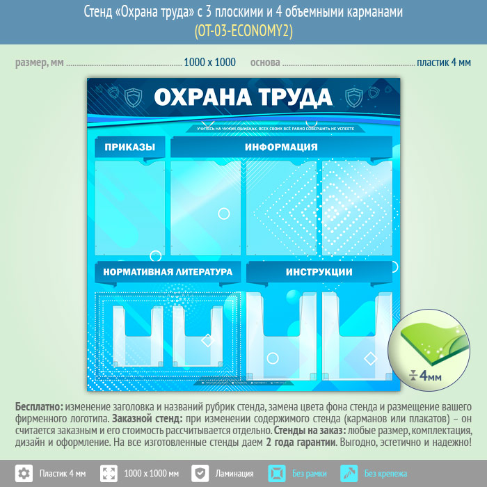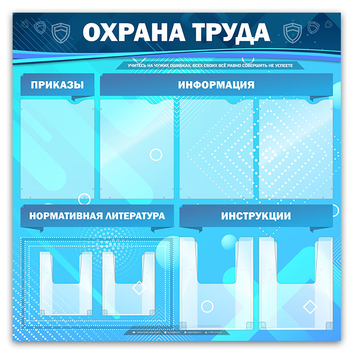 Стенд «Охрана труда» – стенд с карманами для самостоятельной комплектации: один плоский карман А4 формата для размещения инструкций, 3 плоских А4 кармана для информации по охране труда, два объемных кармана А5 формата под нормативную литературу и два объемных кармана А4 формата под инструкции…