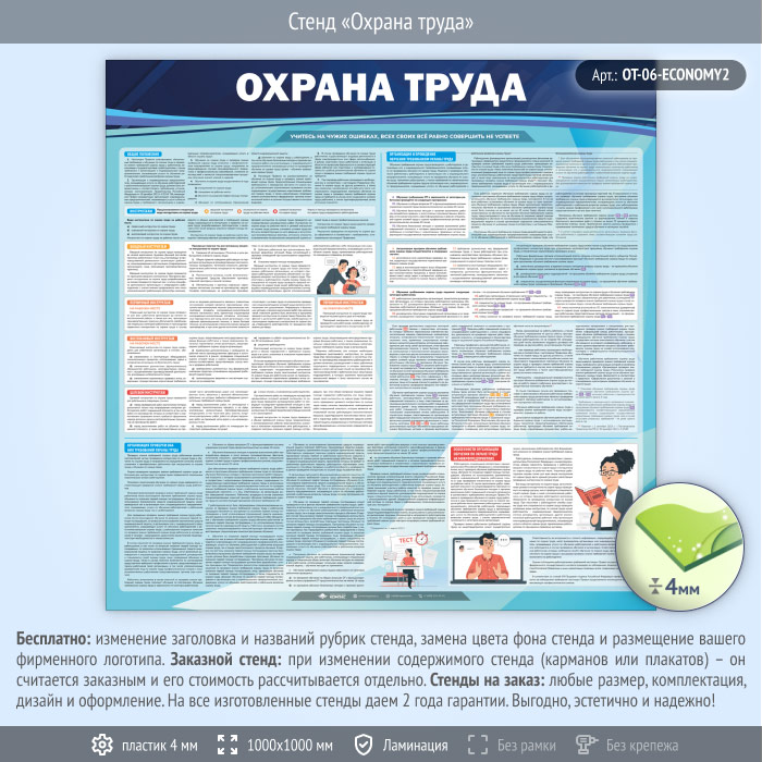Стенд «Охрана труда» (OT-06) содержит порядок проведения всех видов инструктажей, информацию об организации и проведении обучения требованиям охраны труда, а также об организации проверки знаний и особенностях организации обучения по ОТ на микропредприятиях.