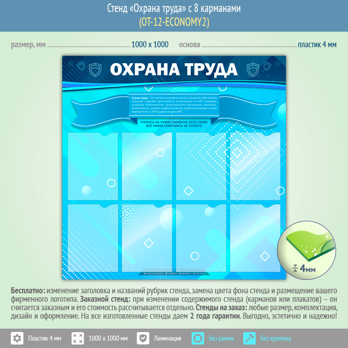 Стенд «Охрана труда» – это 8 плоских карманов А4 формата для самостоятельного размещения необходимой информации – будь то графики или инструктажи, приказы или инструкции, нормативы или объявления…