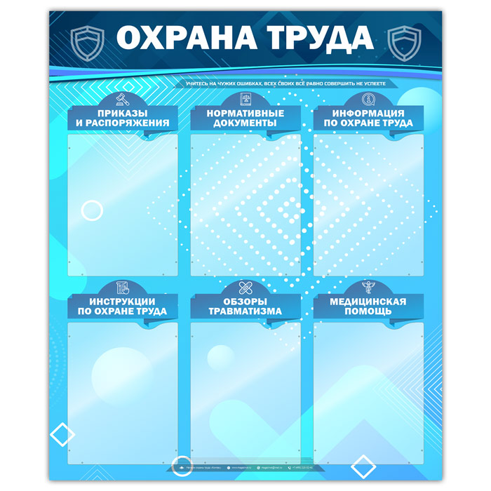 Стенд «Охрана труда» – это шесть плоских карманов А4 формата книжного расположения со следующими рубриками: приказы и распоряжения, нормативные документы, информация по охране труда, инструкции по охране труда, обзоры травматизма, медицинская помощь…