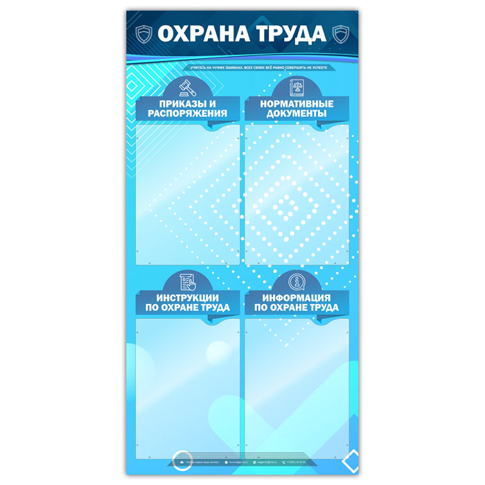 Стенд «Охрана труда» – это 4 плоских кармана А4 формата под приказы и распоряжения, нормативные документы, инструкции по охране труда, информация по охране труда…