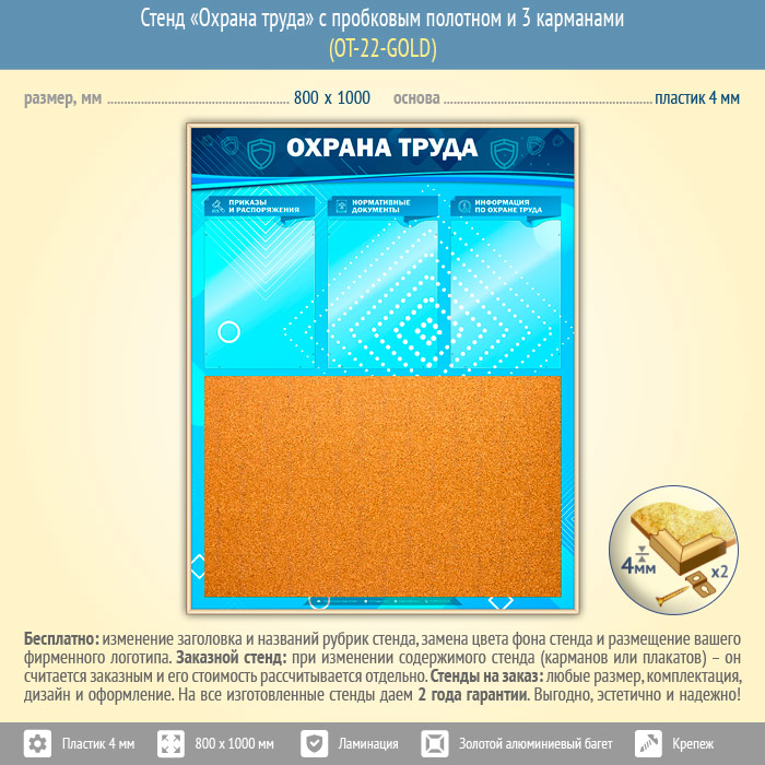Стенд «Охрана труда» с пробковым полотном и 3 карманами (OT-22-GOLD)