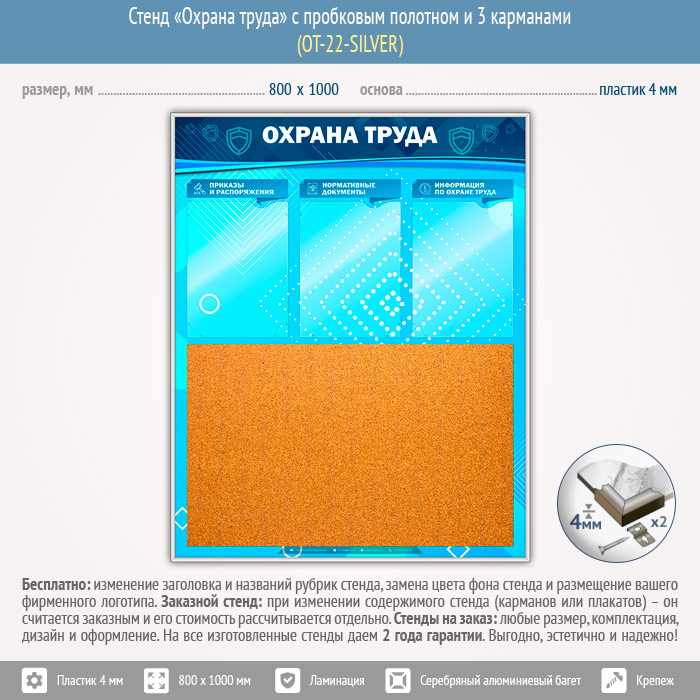 Стенд «Охрана труда» с пробковым полотном и 3 карманами (OT-22-SILVER)