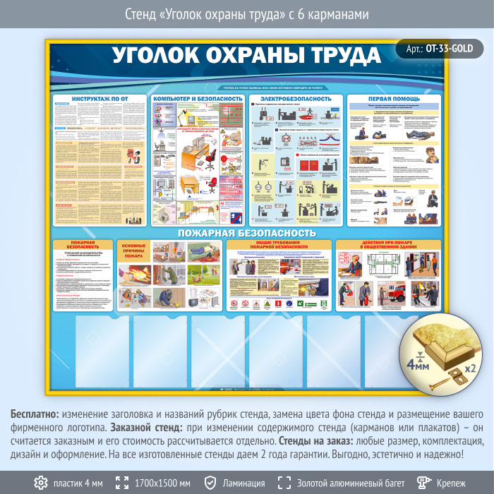 Стенд «Уголок охраны труда» с 6 карманами (OT-33-GOLD)