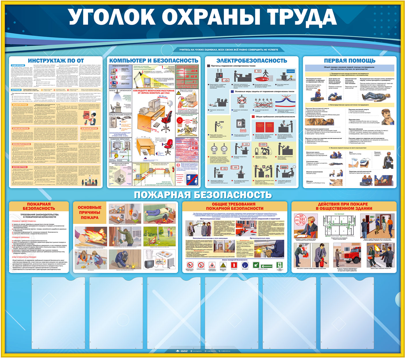 На стенде «Уголок охраны труда» размещена самая основная информация по инструктажу охраны труда, яркая и наглядная информация по компьютерной безопасности, основные правила по электробезопасности, техника оказания первой медицинской помощи и самая необходимая информация о пожарной безопасности. Также на стенде размещено 6 плоских А4 карманов для самостоятельного размещения информации