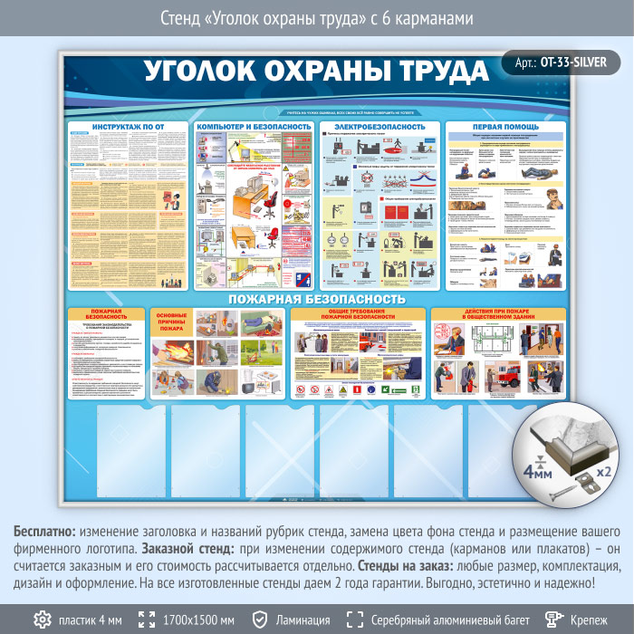 Стенд «Уголок охраны труда» с 6 карманами (OT-33-SILVER)