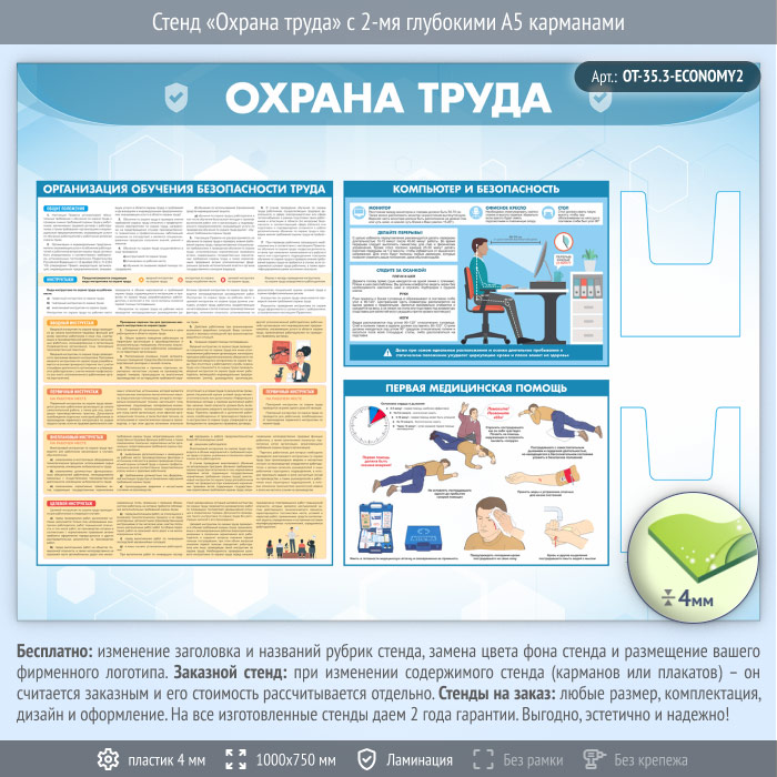 Стенд «Охрана труда» с 2-мя глубокими А5 карманами (OT-35.3-ECONOMY2)