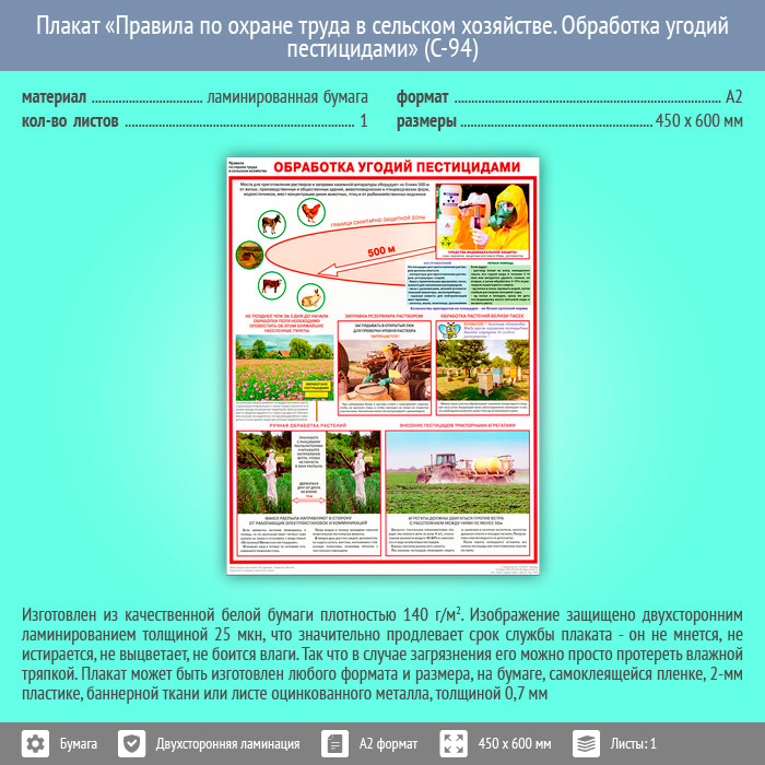 Плакат «Правила по охране труда в сельском хозяйстве. Обработка угодий пестицидами» (С-94, ламинированная бумага, А2, 1 лист)