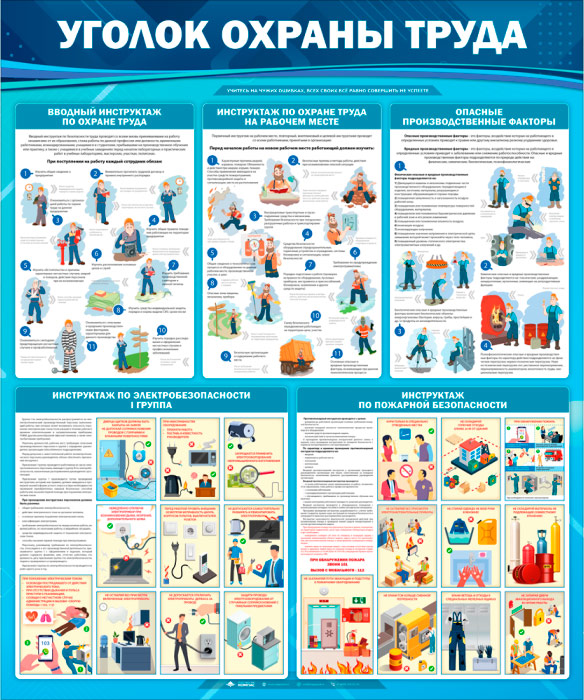 Стенд «Уголок охраны труда» (OT-36.2) содержит вводный инструктаж по ОТ, инструктаж по ОТ на рабочем месте, информацию об опасных производственных факторах, а также инструктажи по электробезопасности и по пожарной безопасности.