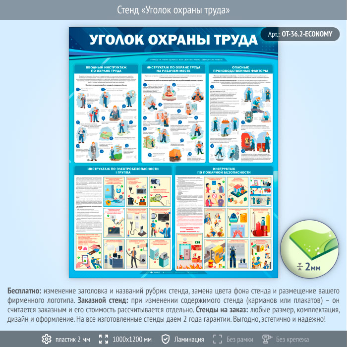 Стенд «Уголок охраны труда» (OT-36.2) содержит вводный инструктаж по ОТ, инструктаж по ОТ на рабочем месте, информацию об опасных производственных факторах, а также инструктажи по электробезопасности и по пожарной безопасности.