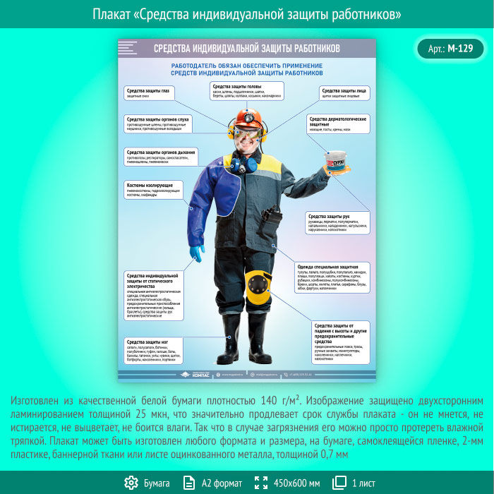 Плакат «Средства индивидуальной защиты работников» (М-129, ламинированная бумага, А2, 1 лист)