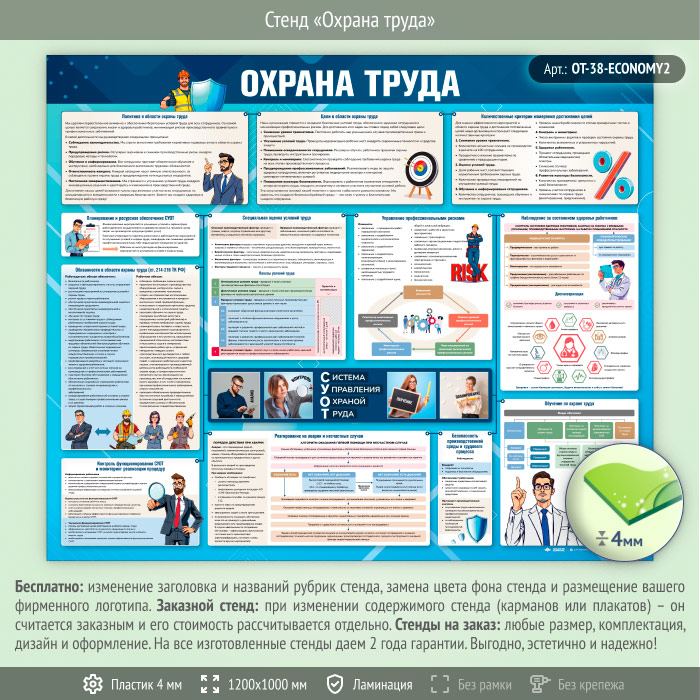 Стенд «Охрана труда» (OT-38)помогает организовать эффективную систему управления охраной труда и обеспечивает работников актуальной информацией для повышения безопасности на рабочем месте.