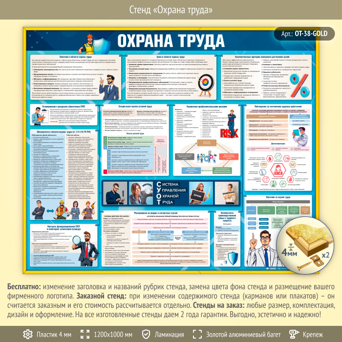 Стенд «Охрана труда» (OT-38)помогает организовать эффективную систему управления охраной труда и обеспечивает работников актуальной информацией для повышения безопасности на рабочем месте.