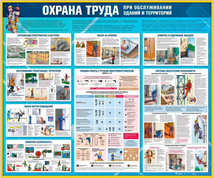 Стенд «Охрана труда при обслуживании зданий и территорий» (OT-41)посвящен вопросам безопасности при выполнении работ по обслуживанию зданий и прилегающих территорий. Освещает основные требования к организации рабочего пространства, выполнению работ на кровлях, осмотру и содержанию фасадов, а также уходу за прилегающими территориями. Особое внимание уделено пожарной безопасности, правилам работы с ручным электроинструментом различных классов и использованию систем обеспечения безопасности. Стенд помогает минимизировать риски, соблюдать нормы охраны труда и обеспечить безопасные условия для персонала.