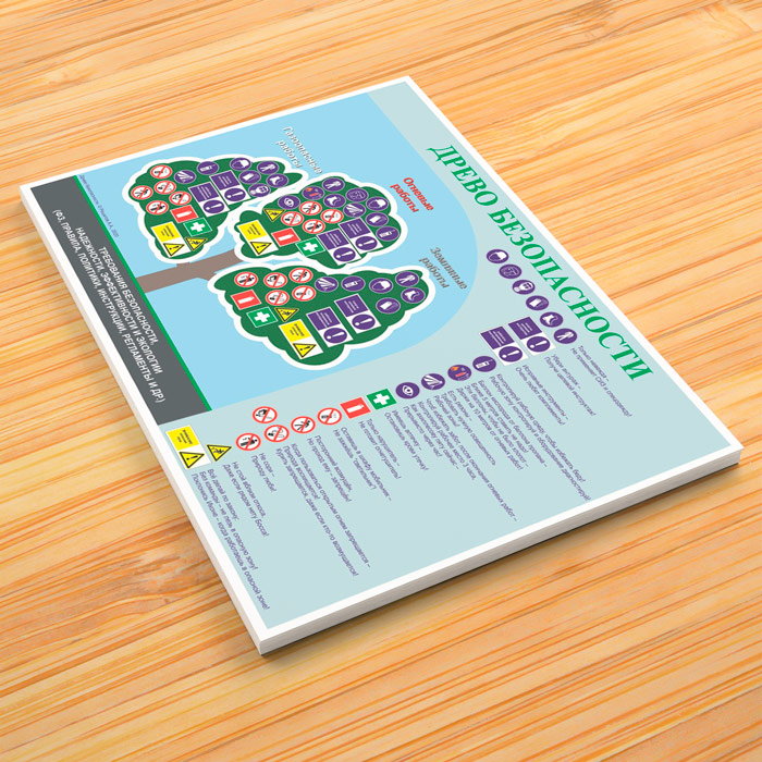 Плакат «Древо безопасности» в запоминающейся стихотворной форме рассказывает о требованиях безопасности, надежности, эффективности и экологии при проведении газоопасных, огневых и земляных работ, например: необходимости применения спецодежды и средств защиты, подготовки огнетушителя и многих других аспектах