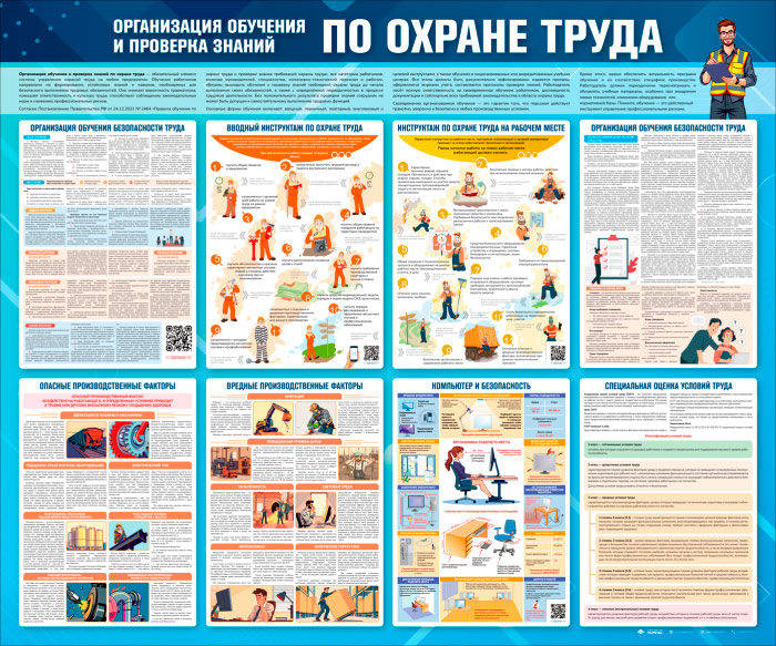 Стенд «Организация обучения и проверка знаний по охране труда» (OT-42)содержит актуальную информацию по организации обучения, инструктажей и проверке знаний требований охраны труда. На плакатах представлены вводный и первичный инструктажи, порядок обучения безопасным методам работы, особенности специальной оценки условий труда, а также описание опасных и вредных производственных факторов. Отдельное внимание уделено требованиям к эргономике при работе за компьютером и профилактике профессиональных рисков. Материал оформлен в наглядной и доступной форме, что облегчает усвоение информации как работниками, так и специалистами по охране труда.