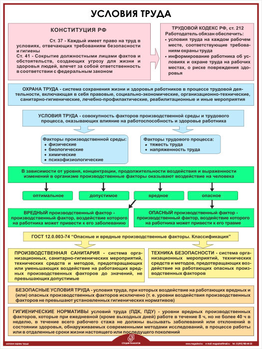 - Плакат «Условия труда» – конституция, кодекс, вредные факторы, санитария, техника безопасности