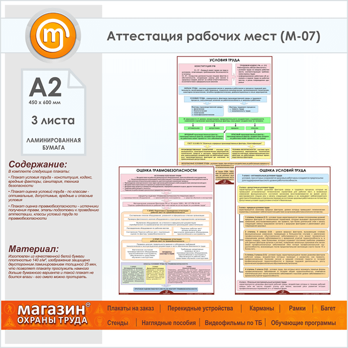 Плакаты «Аттестация рабочих мест» (М-07, ламинированная бумага, А2, 3 листа)