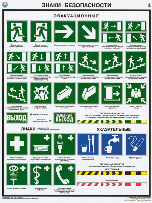 - Плакат с эвакуационными знаками, знаками медицинского и санитарного назначения, указательными знаками и сигнальной разметкой