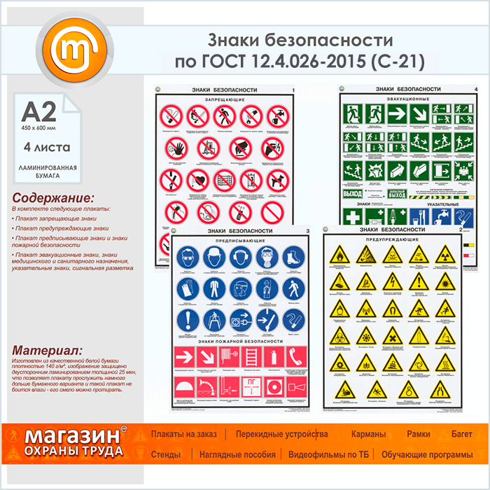 Комплект плакатов «Знаки безопасности по ГОСТ 12.4.026-2015» из 4 листов – достойное качество и полезная информация по приемлемой цене