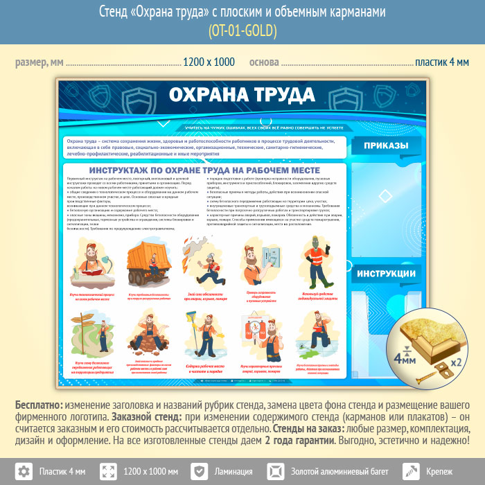 Стенд «Охрана труда» – это, прежде всего, содержательный и качественно проиллюстрированный первичный инструктаж на рабочем месте и два кармана: плоский А4 формата – для приказов и объемный А4 – для инструкций…