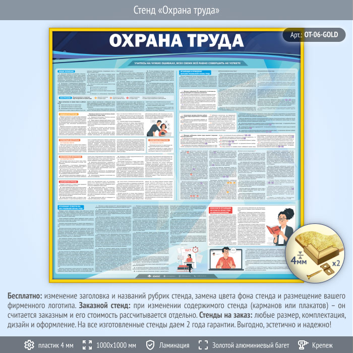 Подводя итог вышесказанному, к главным преимуществам данного стенда, изготовленного на пластике 4 мм в золотом алюминиевом багете можно отнести шикарный внешний вид, использование качественных и экологически безопасных материалов, высокие эксплуатационные свойства, качественный дизайн, а также соответствие современным нормам и правилам техники безопасности