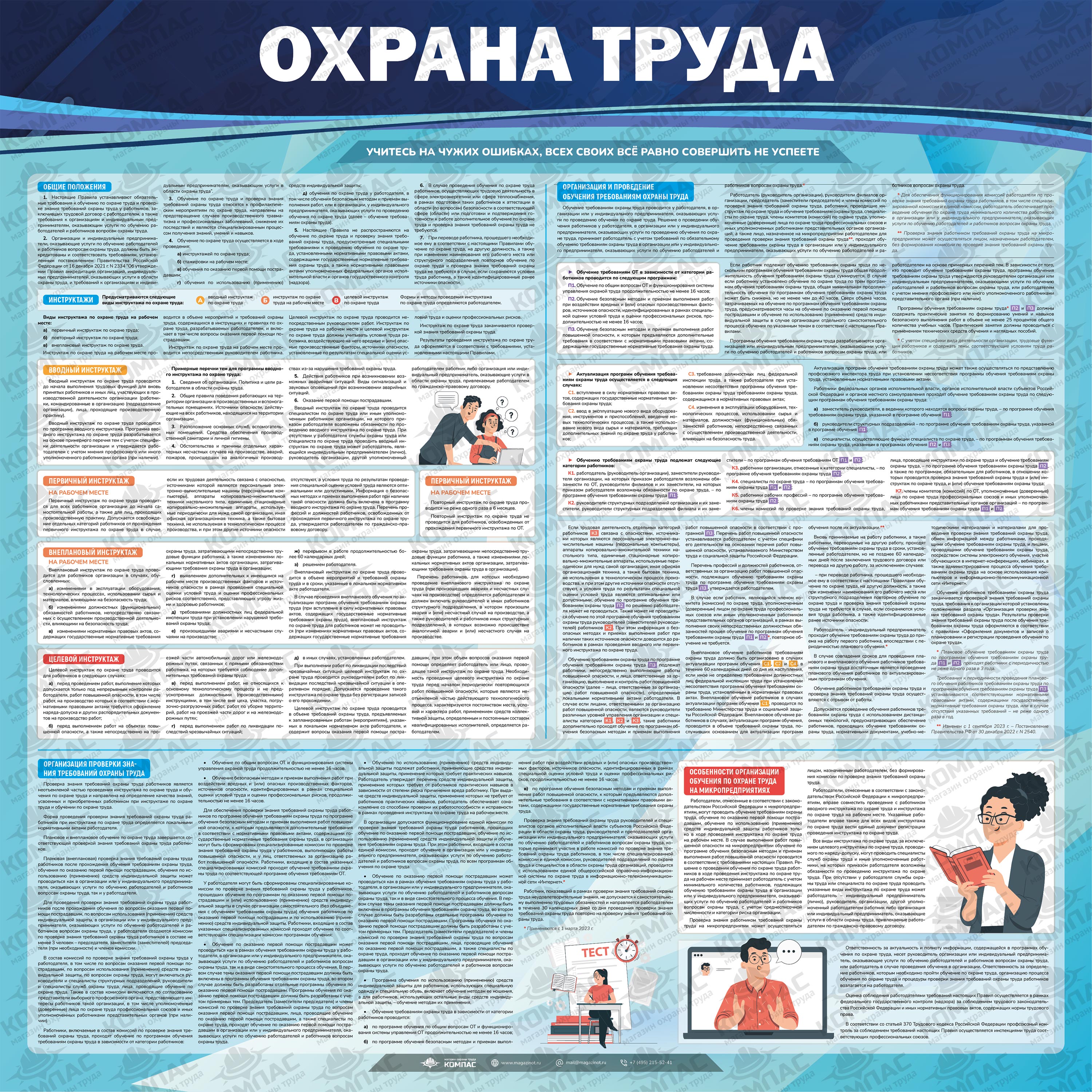 Стенд «Охрана труда» (OT-06) содержит порядок проведения всех видов инструктажей, информацию об организации и проведении обучения требованиям охраны труда, а также об организации проверки знаний и особенностях организации обучения по ОТ на микропредприятиях.
