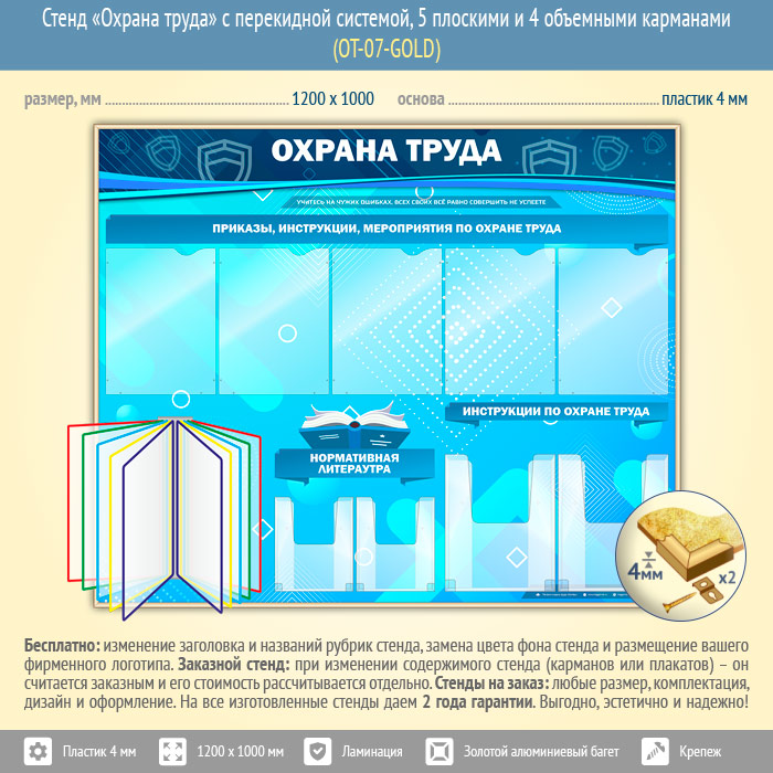 Стенд «Охрана труда» – это 5 плоских карманов А4 формата для самостоятельного размещения необходимой информации – приказов, инструкций, планов мероприятий по охране труда; два объемных А4 кармана предназначено для размещения инструкций, 2 объемных кармана А5 формата – для нормативной литературы; и перекидная система для удобства информирования читателя…
