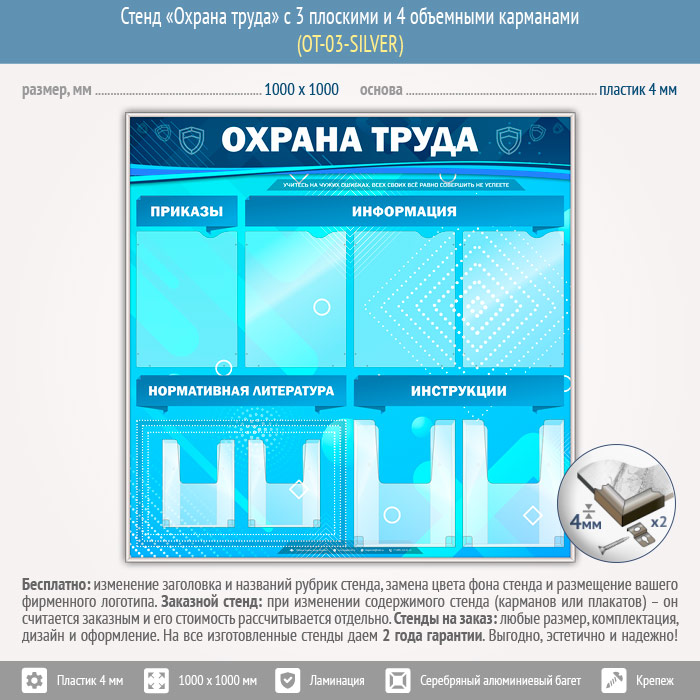 Стенд «Охрана труда» с 4 плоскими и 4 объемными карманами (OT-03-SILVER)