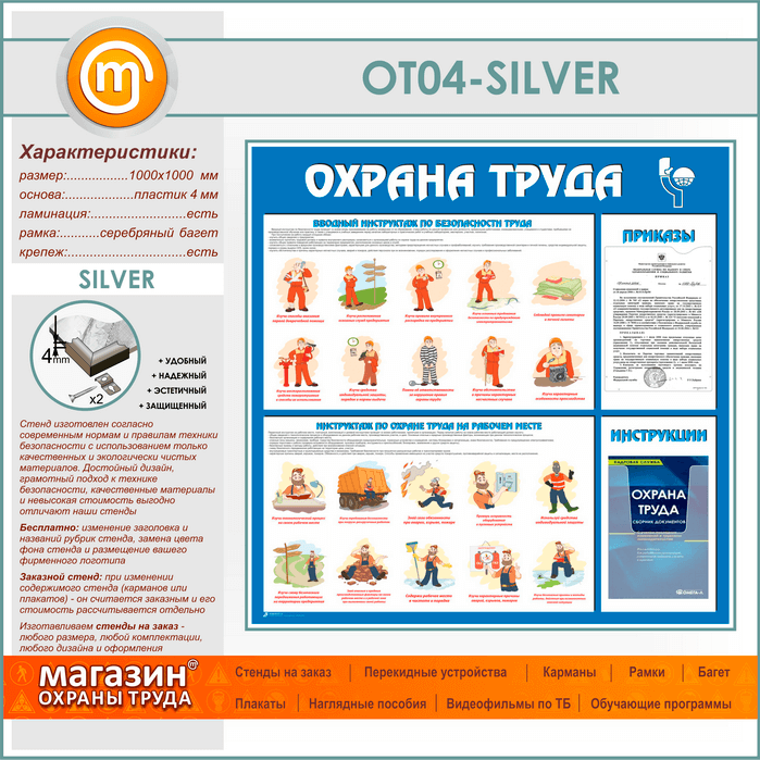 Стенд «Охрана труда» с плоским и объемным карманами (OT-04-SILVER)