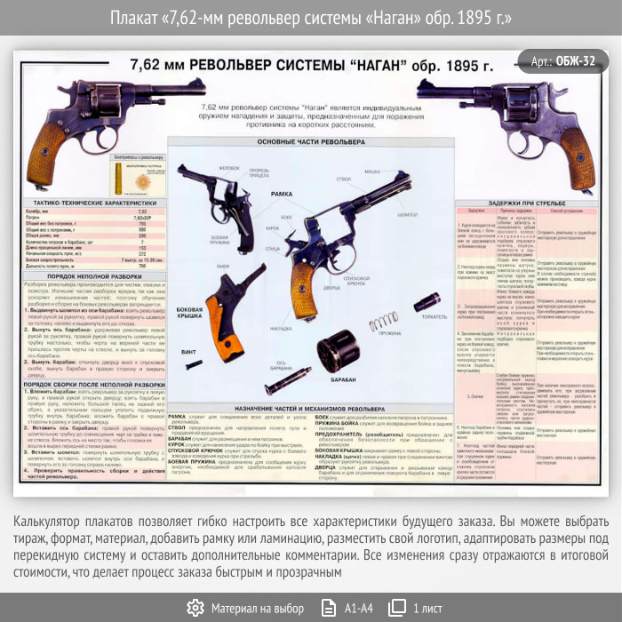 Плакат «7,62-мм револьвер системы «Наган» обр. 1895 г.» (ОБЖ-32, 1 лист)
