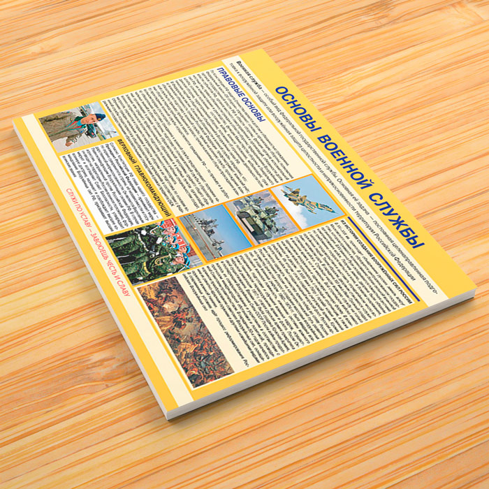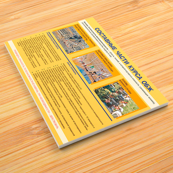 - Плакат «Составные части курса ОБЖ» – основы безопасности личности, общества и государства, здоровый образ жизни и оказание первой помощи, основы военной службы
