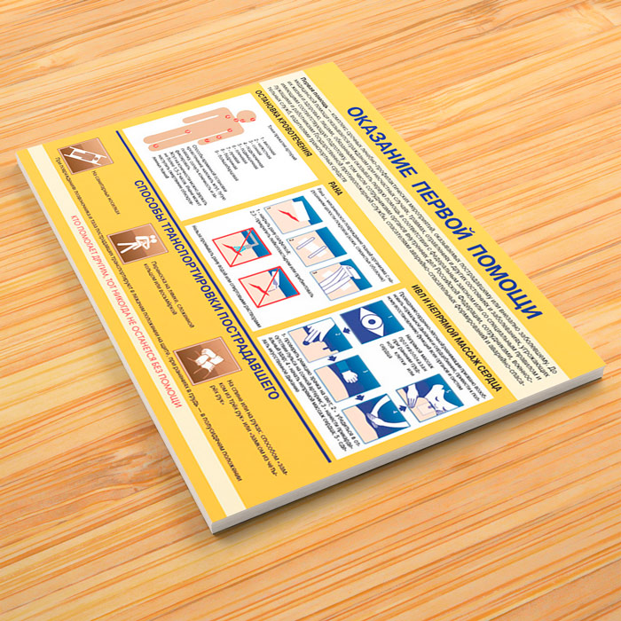 - Плакат «Оказание первой помощи» – остановка кровотечений, обработка ран, ИВЛ и непрямой массаж сердца, способы транспортировки пострадавшего