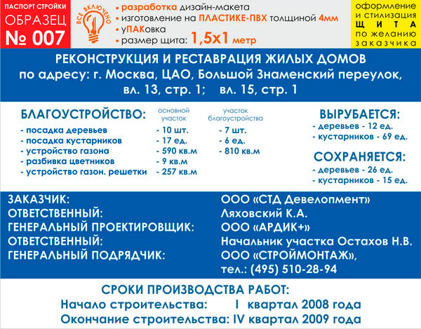 Паспорт стройки, образец № 7 (пластик 4 мм, 1500х1000 cм)