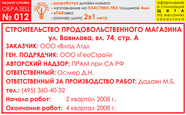Паспорт стройки, образец № 12 (пластик 4 мм, 2000х1000 cм)