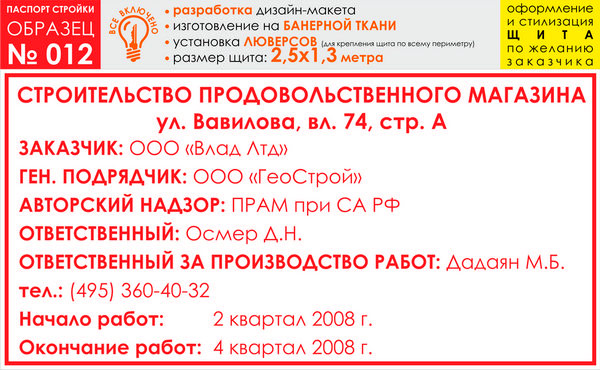 Паспорт стройки, образец № 12 (баннерная ткань, 2500х1300 cм)