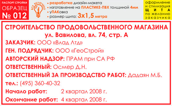 Предлагаем Вам изготовление паспорта стройки на баннерной ткани и ПВХ-пластике. В цену включены: разработка и согласование макета, изготовление и упаковка, а также НДС 18%. На данной странице представлены варианты материалов и размеров для образца № 12. Помимо представленных размеров мы можем изготовить паспорт объекта любого другого размера (цену уточняйте у менеджеров) и на любом материале (включая металл)
