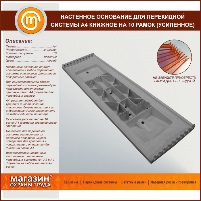- Основание рассчитано на 10 рамок А4 формата вертикального крепления