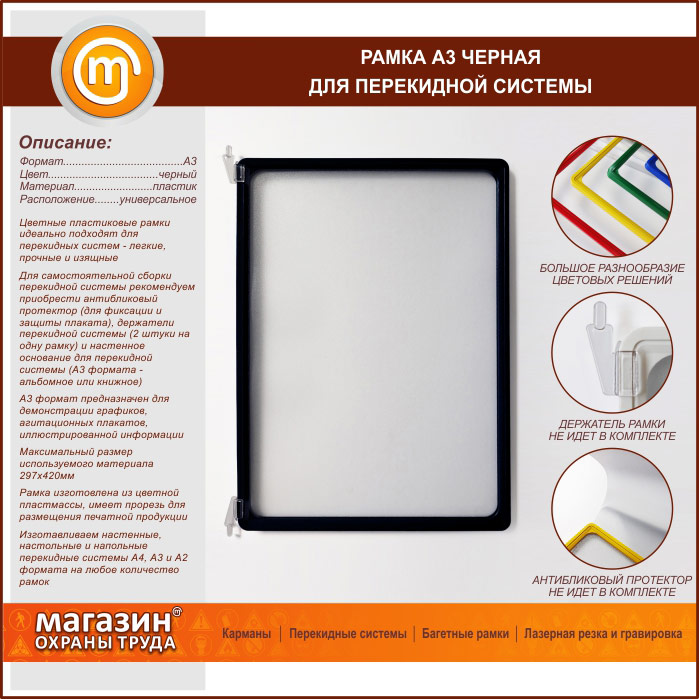 - Для самостоятельной сборки перекидной системы рекомендуем приобрести антибликовый протектор (для фиксации и защиты плаката), держатели перекидной системы (2 штуки на одну рамку) и настенное основание для перекидной системы (А3 формата - альбомное или книжное)